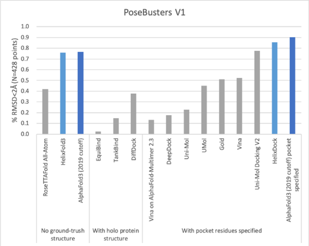 ▲ 圖1 PoseBusters V1數(shù)據(jù)集上AlphaFold3復(fù)現(xiàn)工作與同類模型的精度表現(xiàn)