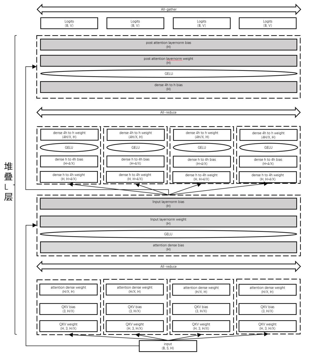 下圖展示了基于模型并行的大模型推理切分方案,通過模型縱向切分,充分利用多卡訪存/算力,并深度優(yōu)化通信算子,高效降低多卡并行推理帶來通信開銷。