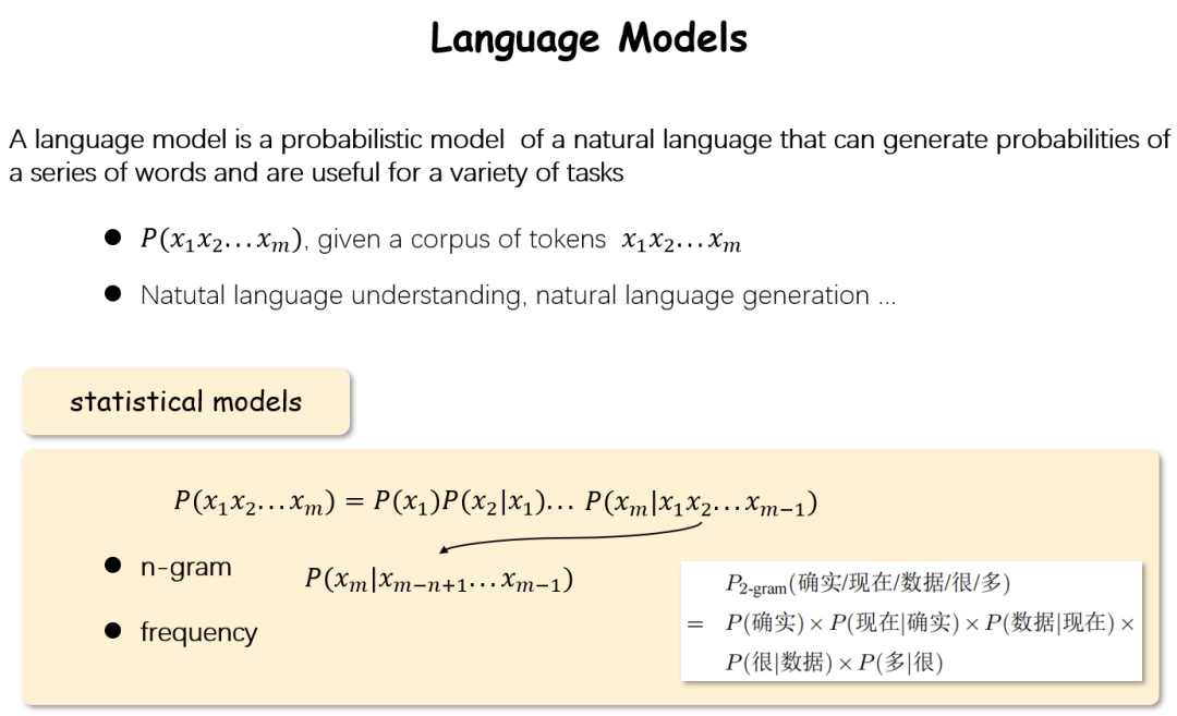 說到LLM就不得不提LM(language model語言模型)。語言模型是這樣一個模型:對于一句話(由詞組成的序列),它能夠計算出這句話出現(xiàn)的概率。為了讓模型給出這樣的概率P,最簡單的方法就是將其用概率論中的方法進行展開,這樣只要想辦法得到每一個P(xm|x1x2...xm-1)即可。這樣從另一個角度來看,如果我們可以找到一個模型:它能夠計算P(xm|x1x2...xm-1),那么它就是一個語言模型。