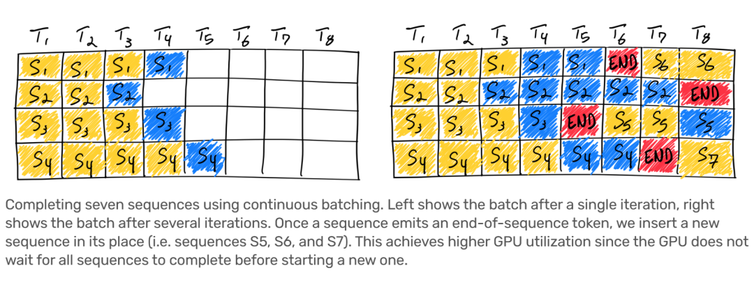 Continuous batching在進行batch>1的推理場景下,一旦batch中的某一個序列推理完成,那么就可以在之后插入一個新序列,從而充分利用GPU使用率。