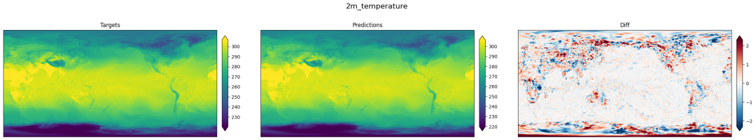 精度更靠譜:在0.25”分辨率(約27 公里)下,Paddlescience復(fù)現(xiàn)的 GraphCast和GenCast模型,對2米溫度、10 米風(fēng)速的72小時預(yù)測誤差,比歐洲中期天氣預(yù)報中心(ECMWF)的傳統(tǒng)模式低 18%-22%。哪怕算到第7天,A1預(yù)測的溫度誤差(2.1°℃)也只有傳統(tǒng)模式(3.2℃)的 65%,連“臺風(fēng),走哪條路”都能預(yù)判得更準(zhǔn)。